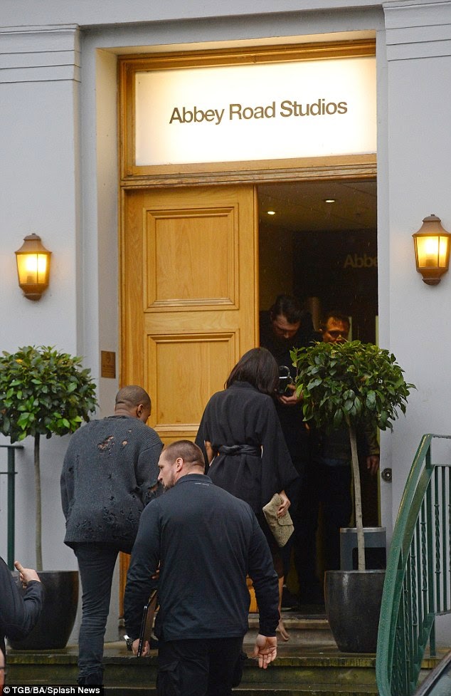 The singer/designer pictured with his wife in this ripped and ruffled sweater that looked like ants had had a go at it, at Abbey Road Studio in London this afternoon. See more photos after the cut..